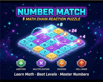 Number Match is a fast-paced math puzzle that makes arithmetic genuinely fun. Start by matching identical numbers, then progress through 45 hand-crafted levels that introduce addition, multiplication, and division — each more challenging than the last. Find pairs that sum to a target, discover factor pairs to master the times table, and crack division problems before the clock runs out. Fever Mode, combo chains, and special tiles keep every session exciting. Whether you're 8 or 80, Number Match is the smartest way to sharpen your mental math — one chain reaction at a time. 🔥